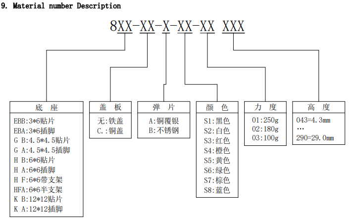 | 6.2.3 | Return Force | The sample switch is installed such thatthe direction of switch operation is vertical and,upon depression of the stem inits center the whole travel distance,the force of the stem to return to its free position shall be measured | 80 gf min |
